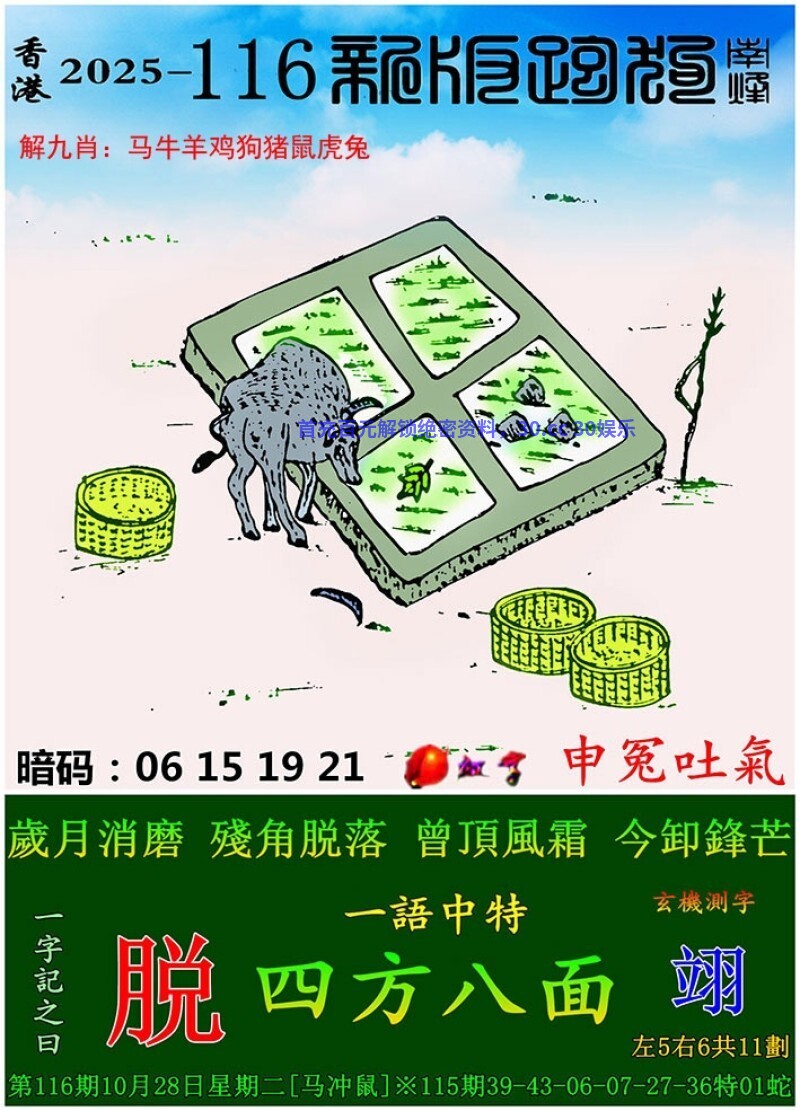 解:今期六畜生肖出在牛,解家禽生肖牛猪鸡羊狗马,十五月亮十六圆,解天肖兔马猴猪牛龙